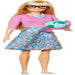 - Barbie® doll is dressed for the classroom in a look with pink top and blue floral skirt, blue necklace, white shoes and black eyeglasses.